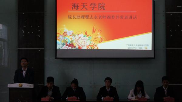 于2015年11月13日星期五下午,在宁波职业技术学院一号楼105室,宁波职业技术学院海天学院团委、学生会第一次全体干部干事会议暨运动会表彰总结大会隆重召开。参加本次会议的有海天学院院长助理翟志永老师、海天学院团委书记张日益老师、海天学院团委韩秀荣老师,以及海天学院团委、学生会全体干部干事。