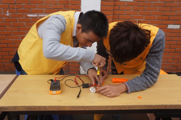 由于是周末的早晨,凤凰社区的大部分居民们在家休息,于是,志愿者们提出兵分两路,一队人在家电维修站点等待需要帮助的居民,另一队人则进入到社区内部向路过的人宣传家电维修活动。经过志愿者们的宣传,免费家电维修站点前很快涌现了大量需要维修家电的居民,严晓军同学和陈炎聪同学为各位居民们耐心讲解电器故障以及在今后使用中需要避免的操作方法。在场的各位居民都纷纷称赞,对维修同学进行表扬。