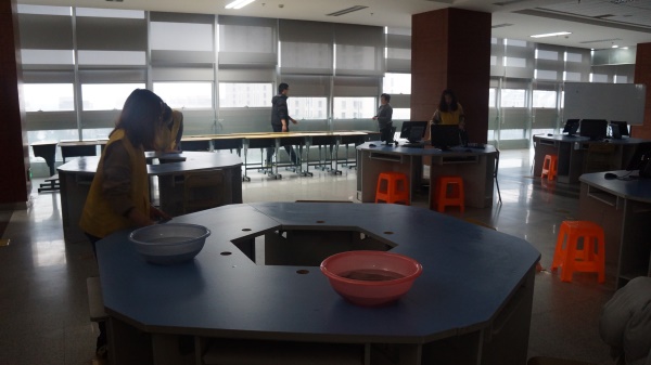 一开始大家做了准备工作,是为了方便接下来的工作。本次图书馆打扫活动主要分为二楼报刊杂志阅览室和四楼共享空间阅览室两个部分。最先开始的时候的大家拿上抹布脸盆等工具到了自己分配到的区域,理齐书架上的杂志和书籍,然后把书架沾染灰尘的地方擦了一遍。整个过程迅速安静,这正是我们学生优良品德和极强的干事能力的体现。接下去他们又擦了图书馆内的桌椅,并按照老师的要求完成了各个任务。