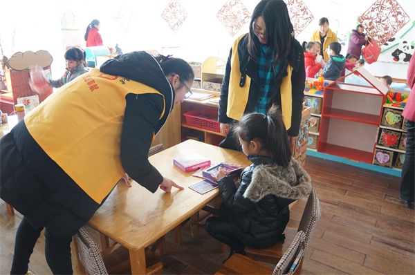 3月25日下午三点,由四名女生组成的志愿者小分队于宁职院南集合。到达幼儿园后,志愿者们纷纷换上志愿者服装,各自前往小朋友的班级,一进入班级就受到了他们的欢迎。