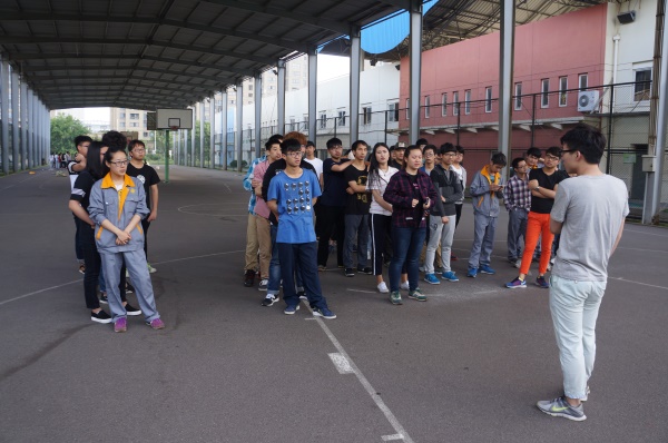 5月23日6点30分,夏天明亮的天色来得格外的早,在校园风雨篮球场的那一角,早已经有一支队伍在等待。他们就是由秘书处主任邱睿带领的海天干事,正准备开始新一期的素质拓展活动。