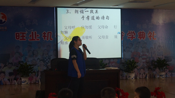 7月14日,海天学院“携手同心,海碶同行”大学生骨干暑期社会实践团队的志愿者丁意玲给橫杨社区假日学校的同学们上了一堂思想品德课——百善孝为先。