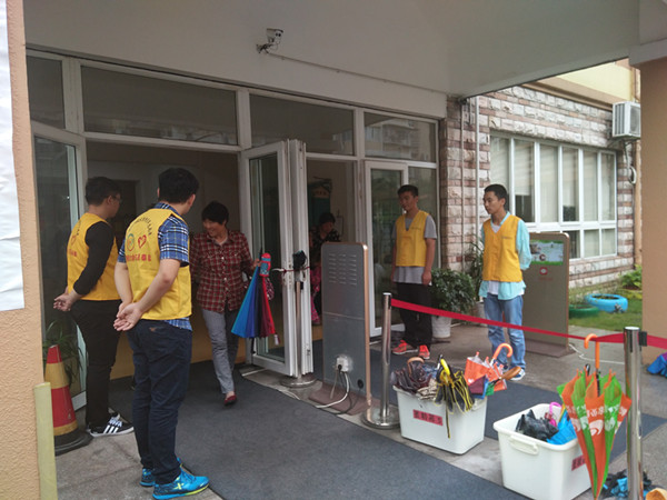 海天学院志愿者到达泰河幼儿园时,小朋友热情地向志愿者们打招呼。为了与小朋友们更加接近,志愿者们给小朋友分发小贴纸,可爱的纸贴赢得了诸多小朋友的欢心,小朋友们把贴纸贴在身上开始和志愿者们一起玩耍。在志愿者的帮助下,小朋友拼出各种心怡的形状。游戏环节结束后,志愿者们配合幼儿园园长安排诸多家长等待孩子放学。放学来临时下起了雨,在志愿者们的维持之下,在雨中家长有序地刷出行卡带领自己的孩子离开。站在雨中维持秩序的海天学院志愿者,体现着海天学院不怕苦的精神。