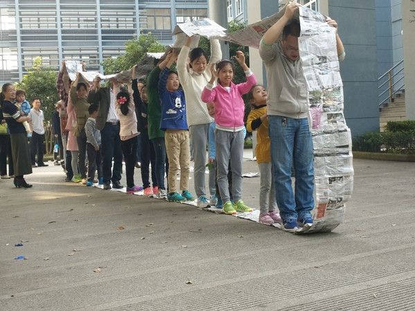 随后指导老师给每个孩子发了一个鸡蛋、两张纸、一双筷子和一卷胶带。孩子们所要做的便用这些材料保护好鸡蛋,使其从高处落下是不会碎裂。孩子们在父母的指导下将自己的奇思妙想制作出了各式各样的保护装置来应对难题。之后指导老师开始给孩子分组,分为了一队和二队。两队各拿了足够的报纸及胶带,开始制作履带。在制作完成后分别进行了三次比赛,先是孩子和孩子比,再是孩子家长一起比,最后家长和家长比。经过三轮比赛最终胜利者是一队。最后蒙眼走,孩子们牵着蒙着眼的家长的手,翻过了台阶,穿过了树林,都安全的在小树林里绕了一圈。这是亲子之间的信任。