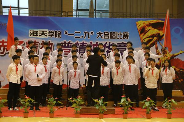 用歌声缅怀历史,以青春展望未来,为纪念一二·九学生运动,于2016年11月25日下午1:00,海天学院在顾国华体育馆举行了以“传赤子精神,普精神华章”为主题的一二·九大合唱比赛。出席本次比赛的嘉宾和评委有北仑区大碶街道横杨社区党委书记兼主任郁亚萍、北仑区大碶街道文化站副站长李颖晖、北仑区大碶街道团工委副书记兼海天学院兼职团委书记曹心怡、机电一体化技术专业王劲老师、模具设计与制造专业刘文耀老师以及各班班主任和专业老师。