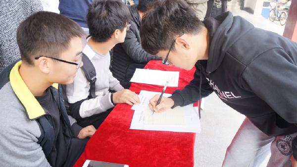 王铖带领着干事们向走来的同学解释活动的内容,并回答他们所提出的问题。前来报名的同学们,在询问好问题和要求后,就和他们的团队在报名表上填上了信息。在台前有两幅海报尤为亮眼,不仅吸引学生们的眼球,而且也充分的表达了举办活动的内容。