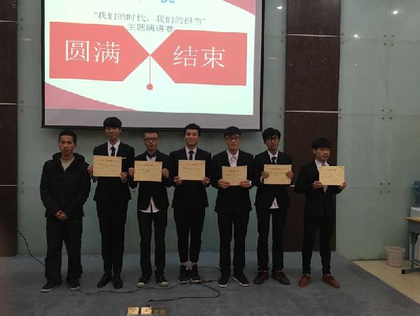 参加本次比赛的是由各班推荐的13位选手。比赛现场,台上选手们热情、激昂地讲述了自己对“我们的时代,我们的担当” 主题的理解及感触,台下观众掌声连连。机电3163的张富刚同学慷慨激昂、缓缓抒情的演讲把整个比赛推向了高潮。最后机电3163的张富刚同学夺得桂冠,电气3161的陈啸天同学、机电3161的周天翔同学获得二等奖,模具3161的陈俊磊同学、机电3161的陆依伦同学获得三等奖。