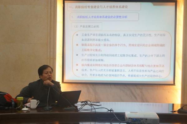 会议开始,田教授对系统化人才培养方案开发与设计、实验实训建设与运营、日常教学管理与运行、师资队伍建设与管理、学生素质养成教育和培养质量监控评价与反馈分别进行了讲解。田教授认为这是的高职院校人才培养体系建设的理论基础。培养人才就要按照实验实训基地的功能与定位,依据实验实训基地的设置原则,采用总体设计,系统优化、分布实验的方法,创建以学习领域与职业领域双向确定实验实训基地的设置、功能分化、设备配置、布局安排、实训项目、管理运营等为一体的建设管理与运营的体系。最后田教授对高职教育专业建设与人才培养体系建设的关系进行了解释。