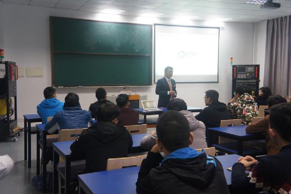 讲座一开始,来自新加坡的陈先生向大家介绍了自己在德国的经历,以及自己是如何从酒店经营从而走向机械专业的过程。在此之中,陈先生还向大家描述了如何从月销售量0台注塑机从而一步一步走向成功。与此同时他也对工业革命做了详尽的分析,并且强调工业4.0将会影响到我们的未来和就业前景。陈先生指出,工业化4.0并非机器代替人工,并从第一次蒸汽工业革命依次介绍到第四次全面智能化工厂革命。随后他为同学们播放了一段制造厂如何把选好的设计做模拟的视频。他认为“先智人后智造”,包括李克强总理最重视的“中国制造2025”计划。在这整个宣讲会过程中,同学们都全神贯注地听着陈文奇先生的介绍,并思考自己的未来。