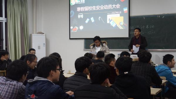 为加强对寒假留宿学生的安全教育,增强留校学生的安全防范和安全责任意识,同时也为了加强寒假期间留校学生的安全管理,营造安全和谐的住宿环境,于1月9日晚上8:00在海天楼514教室开展了寒期留校生安全动员大会。主持此次会议的是海天学院团委书记张日益老师,参加本次会议的是海天学院的寒假留校学生。
