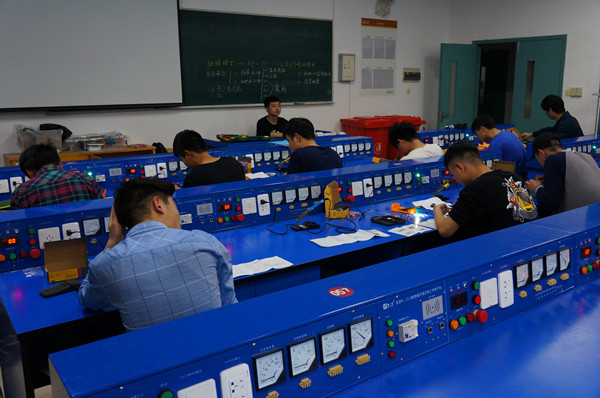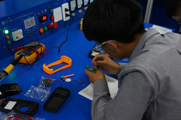 针对海天学院各专业群教学特点,制定了比赛规则及评分细则并精心设计了比赛试题。通过考核元器件焊接、比拼安装速度,让参赛选手在两小时内完成万用表焊接、安装并能正常运行,从多个方面检验学生的学习成果。随着技能竞赛正式开始,选手们有序进入赛场开始了紧张而激烈的比赛。选手们一人一个工位,各执专用具,一会审视图纸,一会接线,展现出平时良好的训练效果。