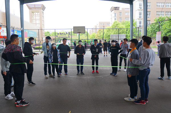 干事们早早的在风雨篮球场进行了集合,精神抖擞的等待着新一天的晨练的开始。在慢跑热身之后就开始了今天的晨练。首先,由孟吉人为同学们讲解了本次晨练游戏的主要规则,每一个小组用四根橡皮绳,蒙上眼罩,成一字向前走十步,再由小组内成员相互合作,使得四根橡皮绳围成一个正方形。在看不见的情况下,需要的是成员之间的相互信任,相互沟通,锻炼的是成员们的执行力。在领导者的领导下,成员们齐心协力,团结互助,完成了本次游戏任务。游戏结束之后,团学培训班的成员开始踢毽子游戏,在欢快轻松的氛围下结束了本次晨练。