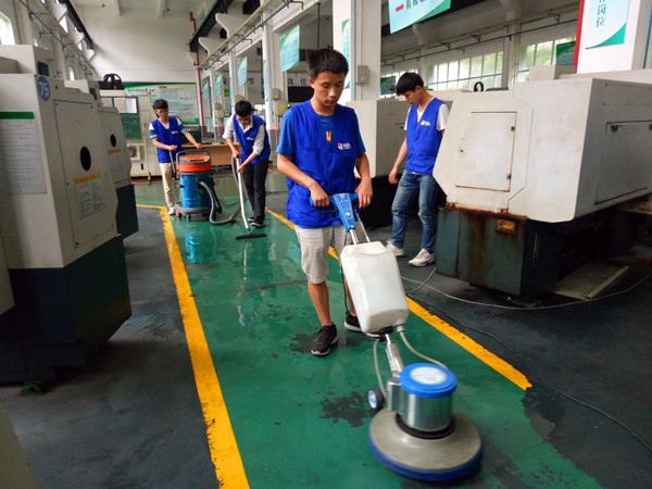 为保证海天学院一楼实训车间的整洁,于5月15日傍晚5:00,我院义工大队进行了实训车间的打扫。图为: