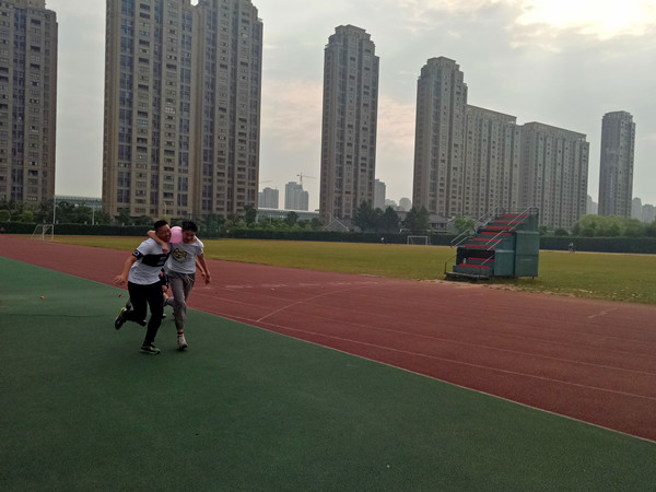 晨练刚开始,高超先让干事们慢跑两圈热身。接着开始了今天的游戏环节。本次的游戏是“背对背运球”,游戏规则是:“各小组成员两两之间背靠背,将气球放中间,绕对面放置的气球跑一周,最后的一组需要接受惩罚。”本次游戏共分两大组进行比拼。各小组通过自己的努力,完成了本次的游戏。第三小组和第五小组接受了惩罚,惩罚方式为两两之间用身体夹破气球。最后,各小组代表为此次晨练作了总结,罗森科向大家介绍了团学培训班的考核方式。