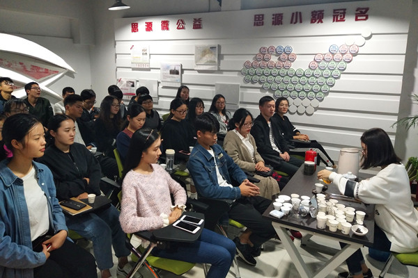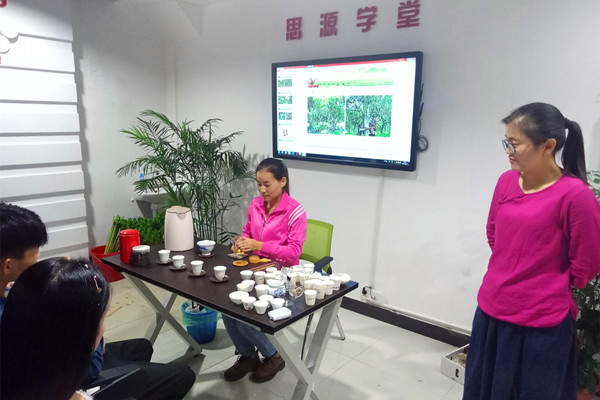 下午六点二十分,章丽丽老师在活动正式开始之前为同学们泡了茶,茶水晶莹剔透,温润儒雅,在老师手中如丝绸般倾入茶杯中,传递给每一位同学,在茶香满溢的思源主题馆内此次分享课开始了。此次分享课程章丽丽向同学们介绍了茶文化在中国的形成、发展及传播历史,以及茶树栽培、茶叶加工与分类等茶艺学基础知识,学会茶叶冲泡等茶艺基本技能等。