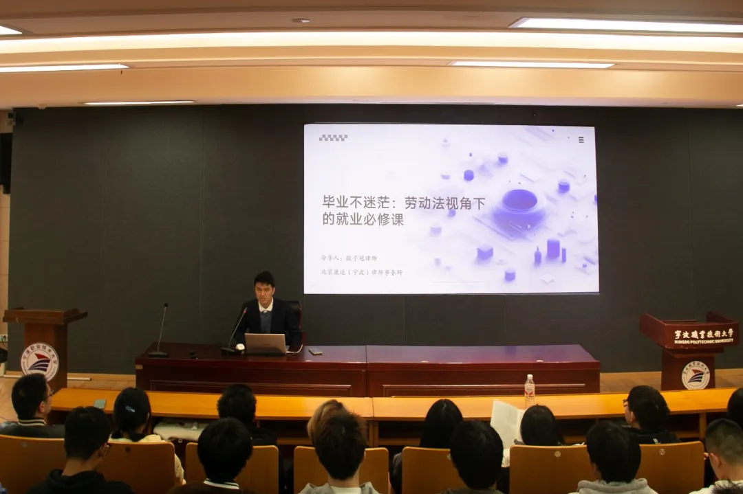 本次讲座特邀北京康达(宁波)律师事务所殷子冠律师担任主讲,为现场40余名毕业生带来了一场生动实用的劳动法“必修课”。