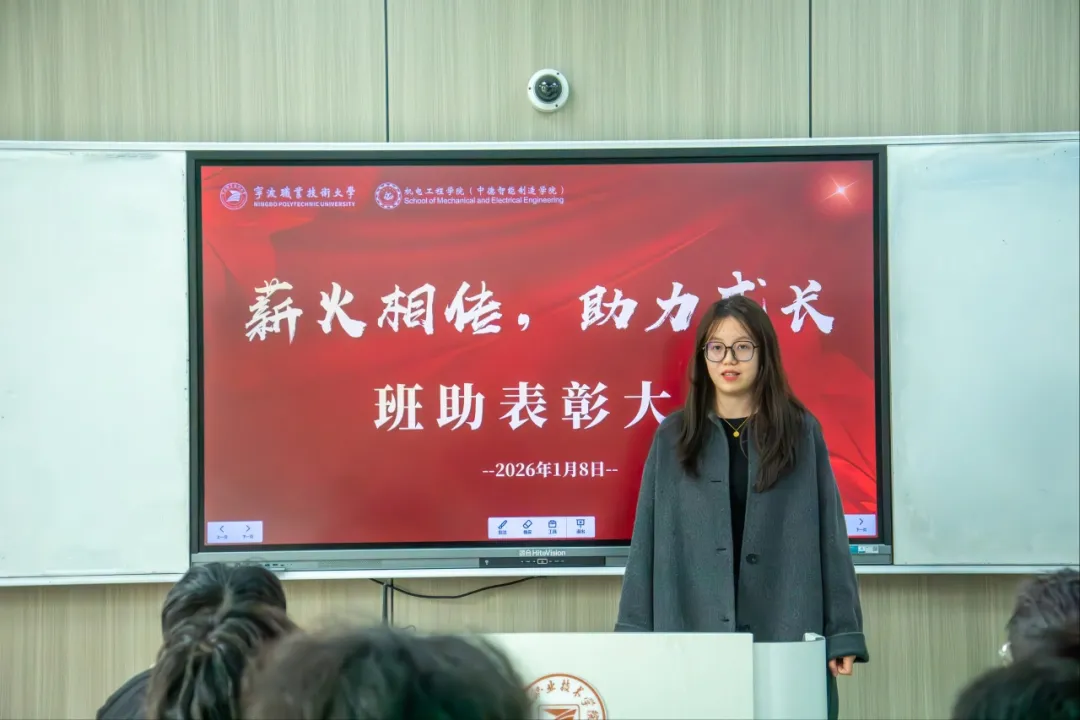冬日暖阳映初心,温情聚力赴新程。为表彰先进、弘扬奉献精神,1月8日,机电工程学院(中德智能制造学院)“薪火相传,助力成长”班助表彰大会顺利召开,本次大会由辅导员陈超尘老师主持,回顾班助工作成效,致敬青春担当。