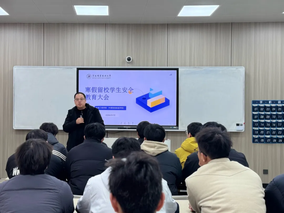 为进一步强化寒假留校学生的安全防范意识,保障假期校园生活平稳有序,切实做好留校学生服务管理工作,机电工程学院(中德智能制造学院)于2026年1月12日中午在海天楼505召开全体寒假留校学生安全教育大会。学院党委副书记陈宇、学院副院长张威、辅导员陈希以及留校学生参加了会议。