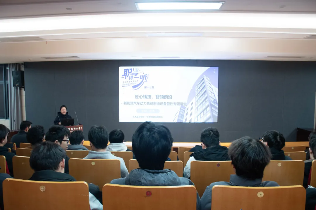 2025年12月30日,机电工程学院(中德智能制造学院)在天童厅举行“匠心铸技·智领前沿——新能源汽车动力总成制造设备管控专题讲堂”。本次讲座特邀浙江吉利汽车集团首席工匠、高级工程师、高级技师张亮先生担任主讲人,为24级海天现场工程师班、25级创新班学生带来了一场深入浅出、内容丰富的专业技术分享。