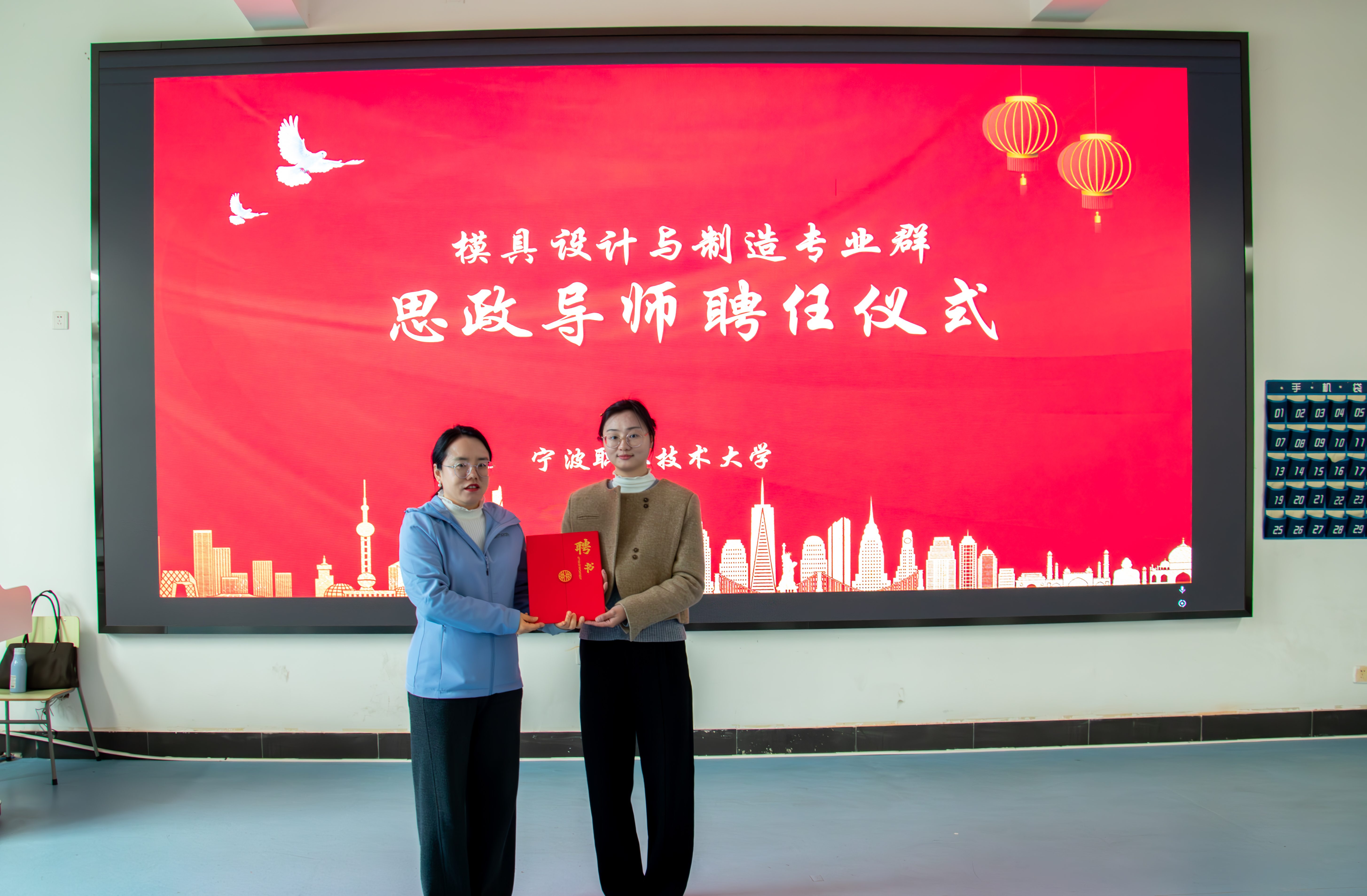 讲座结束后,机电工程学院(中德智能制造学院)党委副书记陈宇为邱银萍颁发模具设计与制造专业群思政导师聘书。据悉,聘任企业行业专家和管理者担任思政导师是机电工程学院(中德智能制造学院)深入推进校企协同思政育人的重要举措之一。未来,思政导师将深度融入人才培养全流程,把企业文化、工匠精神与思政教育有机融合,引导学生树立正确的世界观、人生观和价值观,着力培育兼具职业道德和精湛技术的高素质人才,持续谱写校企育人新篇章。